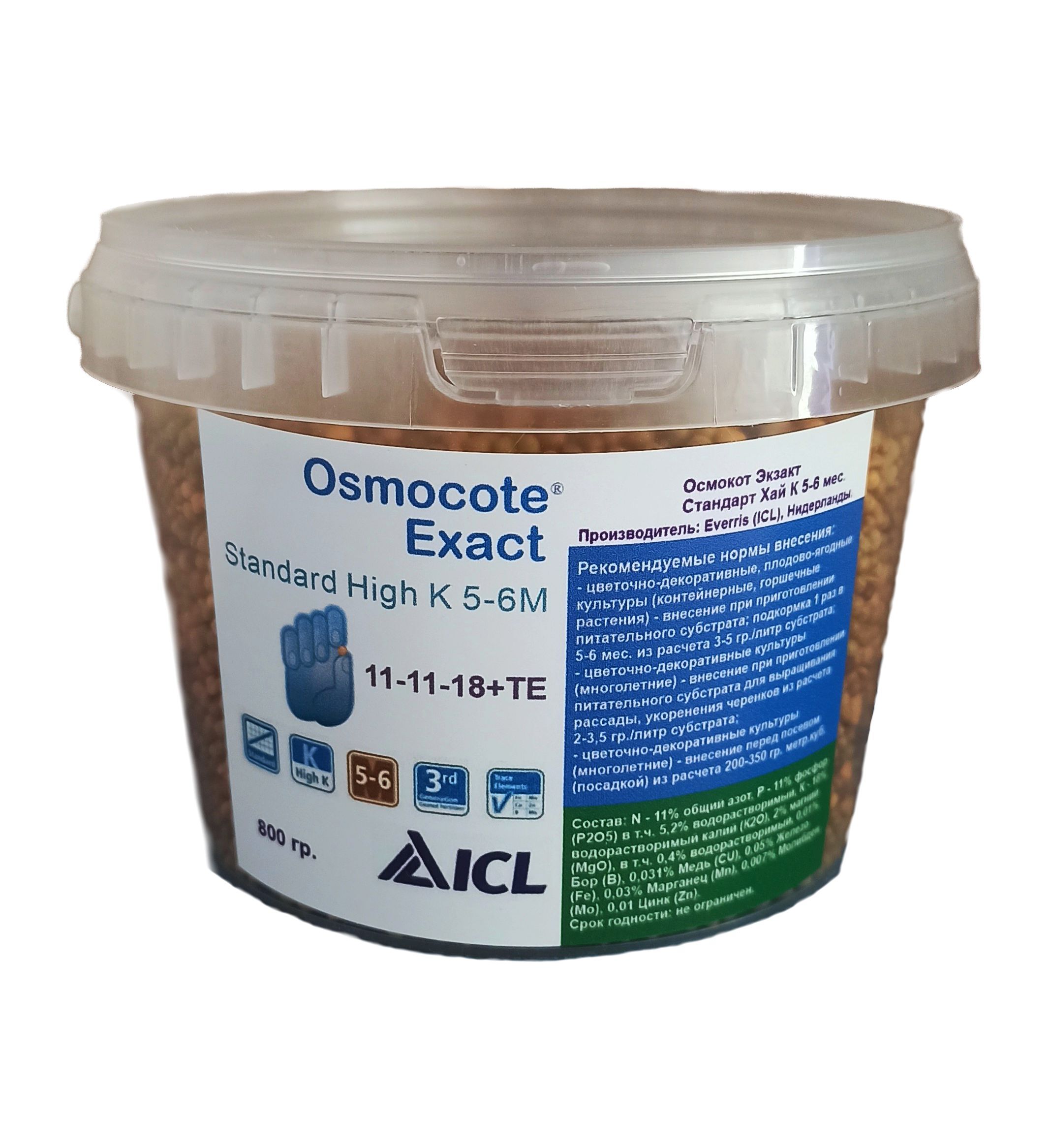 Внесение 1 раз в сезон (частота внесения зависит от периода действия от 2 до 18 месяцев) В каждой грануле содержится необходимое количество макро и микроэлементов, которое высвобождается постепенно, насыщая почву элементами питания в течение всего периода заявленного действия. Практически полное отсутствие вымывания удобрения и максимальный процент усвояемости элементов питания. Полностью отсутствует риск передозировки допустимой концентрации солей. Высокая надежность оболочки и однотипность каждой гранулы обеспечивают, в первую очередь, безопасность и удобство применения удобрения.Основным преимуществом Exact Standard High K является повышенное содержание калия. Лучше всего данное удобрение подходит для плодово-ягодных и овощных культур для формирования плодов в летний период, а также для цветения. В том числе отлично подходит для хвойных и укоренения черенков. Возможно использование для осенне-зимней подкормки домашних растений и растений в открытом грунте.